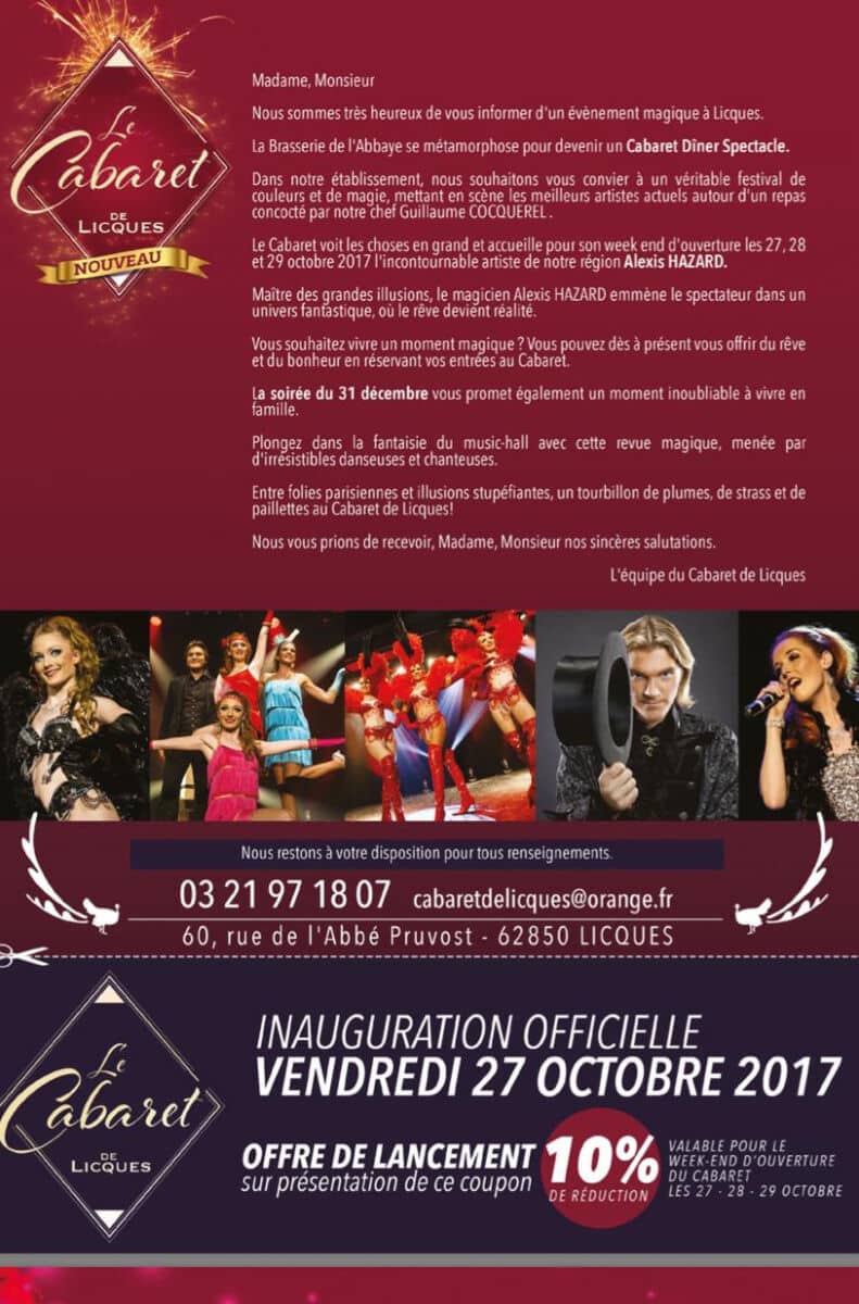 C’est après cette rencontre qu’on a pris la décision de transformer le restaurant de l’Abbaye en un vrai lieu de divertissement. C’était un moment clé, une rencontre qui a littéralement tout changé pour nous et qui a lancé le Cabaret de Licques.